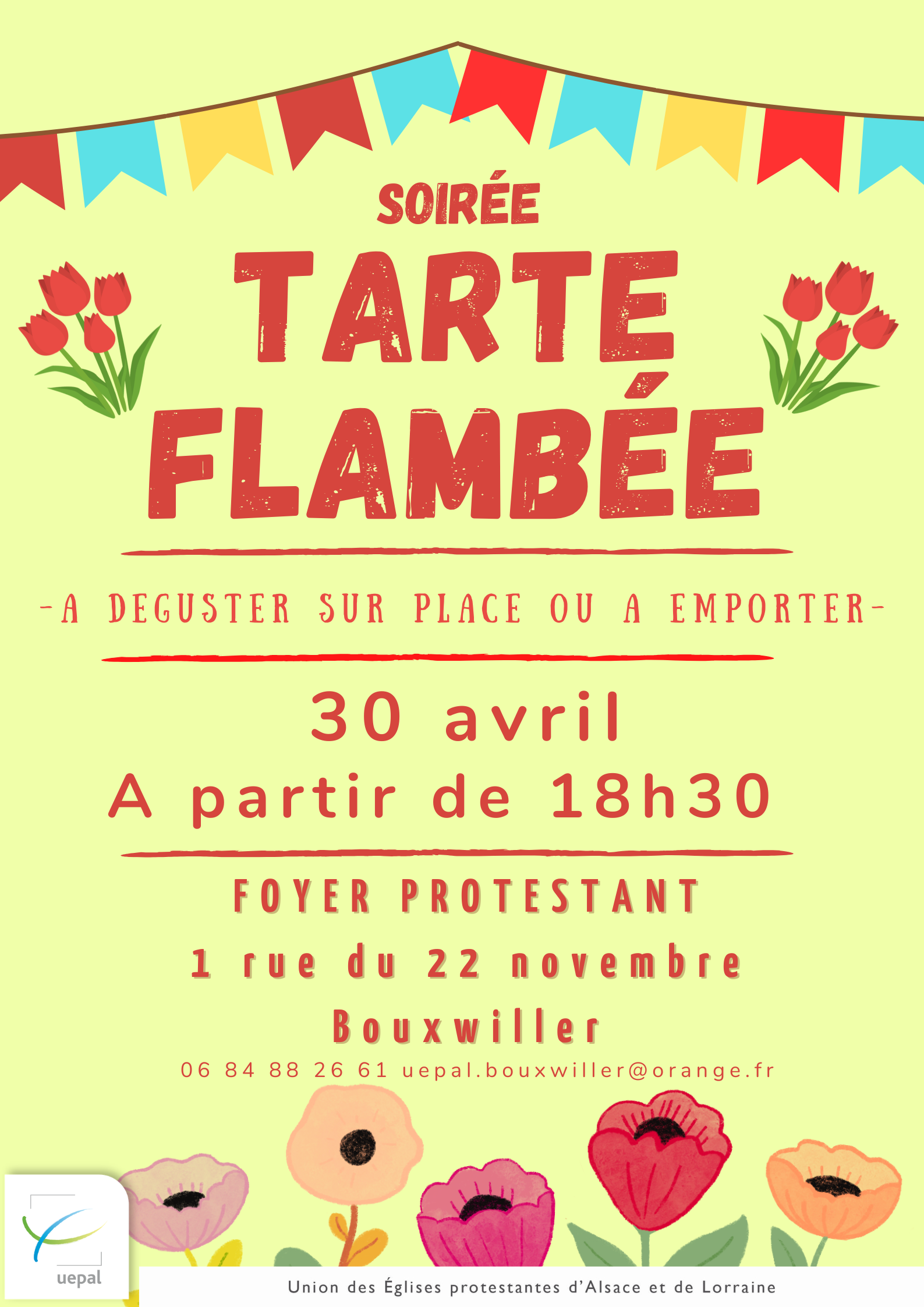 La paroisse protestante de Bouxwiller organise de nouveau une soirée tarte flambée. Le jeudi 30 avril venez déguster ou emporter pour consommer chez vous nos délicieuses tartes flambées : traditionnelles, gratinées, aux pommes et aux pommes arrosées. Venez nombreux passer un moment convivial entre amis et voisins tout en soutenant notre paroisse. |