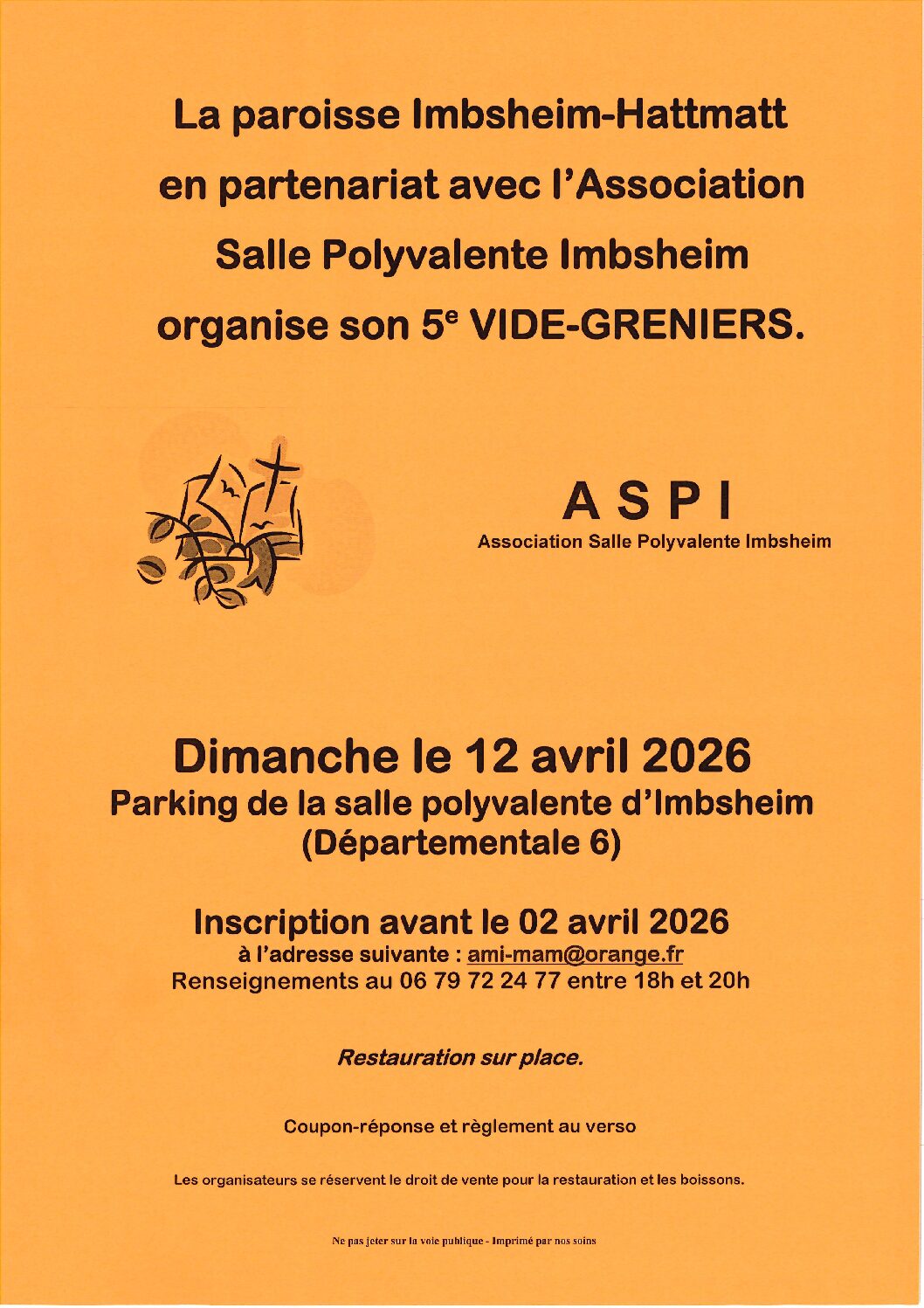 La paroisse Imbsheim-Hattmatt en partenariat avec l’Association Salle Polyvalente Imbsheim organise son 5º VIDE-GRENIERS, le dimanche 12 avril 2026 au parking de la salle polyvalente d’Imbsheim. Restauration sur place.