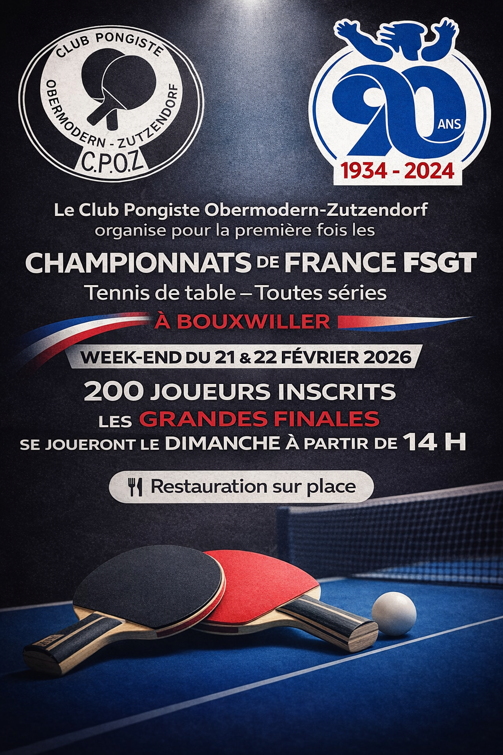 Centre sportif Pierre de Coubertin bouxwiller, FranceLe Club Pongiste d’Obermodern-Zutzendorf (CPOZ) est fier d’organiser pour la première fois une compétition d’envergure FSGT, qui se tiendra les 21 et 22 février 2025 à Bouxwiller. Cette rencontre rassemblera […]